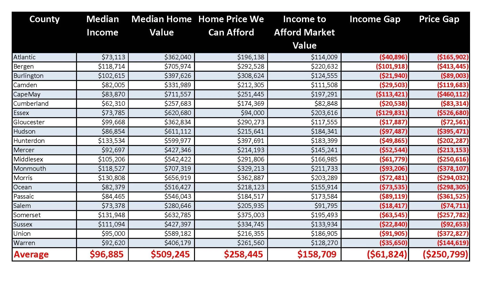 In New Jersey, the average annual income is $96,000. A family can support a mortgage of about $258,000. However, with the average home price over $500,000 in 2022, families face a shortfall of around $250,000.